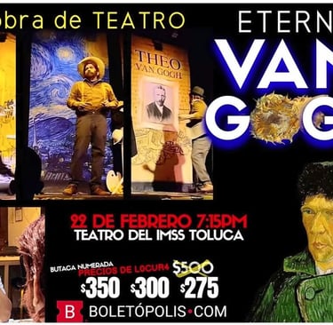 🎨 **$275** BUTACA NUMERADA. **$300** BUTACA NUMERADA**$350** ETERNO VAN GOGH de Víctor Vázquez. Todo mundo habla del genio, del pintor inmortal, pero nadie habla del hombre que se reía, dudaba y se rompía por dentro, nosotros te lo presentamos. *Esta es la obra de teatro BIOGRAFÍCA más EMOTIVA acerca de Vincent Van Gogh. Hay una escena que no debería contarte... pero todos salen hablando de ella, no voy a hacer spoiler, tienes que verla. 18 ciudades, 26 funciones 9,800 espectadores dentro de LA GIRA NACIONAL. Esta obra es verdad emocional, no es "teatro intelectual" es teatro que te toca, aunque no quieras. Es un montaje de La Casa Azul los mismos creadores de "POE, EL MAESTRO DEL TERROR" y "Confesiones de Asesinos" Ve al link y elige ya los mejores asientos. http://eternovangoghtoluca.boletopolis.com/ (en la boletera puedes comprar con tarjetas de crédito o debito, american express, paypal y oxxo) Gran estreno en TOLUCA **ÚNICA FUNCIÓN* 🗓 22 de Febrero – 7:15pm 📍 LUGAR: Teatro del IMSS de Toluca Calle Josefa Ortiz de Domínguez #100 Toluca de Lerdo. 🗺️ https://maps.app.goo.gl/DJsKUPnZYeBp5Q367 🎟 🎟 🎟 🎟 🎟 🎟 🎟 🎟 🎟 🎟 🎟 🎟 BUTACA NUMERADA Zona Vip $350 Fila A a la G. Zona Platino $300 Fila H a la L. Zona Oro $275 Fila M y N. También puedes comprar con depósito o transferencia a nuestras cuentas, así como con Tarjetas de crédito o débito y te enviamos tus boletos por whats. Escribe ya al WhatsApp 81 1714 6013 y pide las cuentas. VENTA EN TAQUILLA EL DÍA DE LA FUNCIÓN 🎟 🎟 🎟 🎟 🎟 🎟 🎟 🎟 🎟 🎟 🎟 🎟 #VanGogh #Vincent #NocheEstrellada #TeatroEnToluca #DondeIrTOLUCA