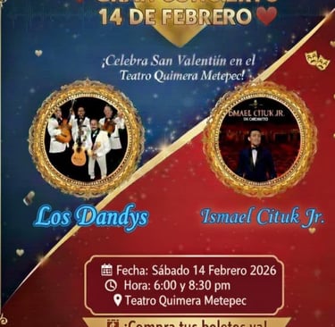Sábado 14 de febrero de 2026. Teatro Quimera Metepec, 6:00 pm y 8:30 pm El amor se canta, se recuerda y se celebra mejor con música en vivo. Este 14 de febrero, vive una velada llena de nostalgia, romance y amistad, donde cada canción será un puente directo al corazón. 💖 Una noche perfecta para dedicar, abrazar y revivir historias de amor al ritmo de grandes voces y melodías que han marcado generaciones. Disfruta de temas románticos, boleros y canciones inolvidables que hablan de: El amor eterno y las promesas que no se olvidan. La amistad que acompaña en cada etapa de la vida. Las serenatas bajo la luna, los recuerdos de un amor que sigue vivo. La pasión, la nostalgia y el romance clásico. Con la participación de grandes exponentes del romanticismo musical: Los Dandys, con sus boleros que han acompañado miles de historias de amor. @Ismael Cituk Jr. , interpretando canciones llenas de sentimiento, con una voz que toca el alma. Una cita perfecta para parejas, amigos y amantes de la buena música romántica. ¡Compra tus boletos ya! Venta de boletos en Neveria Sabrosita Informes WhatsApp: 55 3014 6034 #GranConcierto #DiaDelAmorYLaAmistad #SanValentin #MusicaRomantica #Boleros #LosDandys #IsmaelCitukJr #TeatroQuimera #Metepec #NocheDeAmor @fansdestacados @Fans Danyels