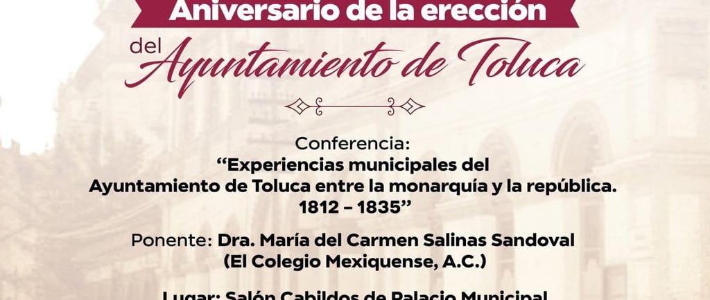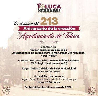 • Se fortalece la identidad toluqueña y se enriquece a la población. Al cumplir los 213 años de la erección del primer Ayuntamiento con la conferencia Experiencias Municipales del Ayuntamiento de Toluca entre la Monarquía y la República. 1812 – 1835, que se llevará a cabo el miércoles 14 de enero a las 16:00 horas en Salón Cabildos de Palacio Municipal. El primer edil invita a la población a conocer parte de la riqueza histórica que tiene la ciudad en voz de la Dra. María del Carmen Salinas Sandoval del Colegio Mexiquense, quien compartirá su conocimiento de forma gratuita y dinámica con los asistentes. Asimismo, los toluqueños podrán informarse con una exposición documental que estará disponible en el Salón Presidentes a partir de las 17:00 horas. Es importante destacar que el 13 de diciembre de 1812 se ha considerado como la fecha oficial de la erección del primer Ayuntamiento, con base en el texto del historiador Aurelio Venegas, por lo que el pasado 13 de diciembre de 2025 se cumplieron 213 años.Conmemora Toluca 213 aniversario de la erección del primer Ayuntamiento • Se fortalece la identidad toluqueña y se enriquece a la población. Al cumplir los 213 años de la erección del primer Ayuntamiento con la conferencia Experiencias Municipales del Ayuntamiento de Toluca entre la Monarquía y la República. 1812 – 1835, que se llevará a cabo el miércoles 14 de enero a las 16:00 horas en Salón Cabildos de Palacio Municipal. El primer edil invita a la población a conocer parte de la riqueza histórica que tiene la ciudad en voz de la Dra. María del Carmen Salinas Sandoval del Colegio Mexiquense, quien compartirá su conocimiento de forma gratuita y dinámica con los asistentes. Asimismo, los toluqueños podrán informarse con una exposición documental que estará disponible en el Salón Presidentes a partir de las 17:00 horas. Es importante destacar que el 13 de diciembre de 1812 se ha considerado como la fecha oficial de la erección del primer Ayuntamiento, con base en el texto del historiador Aurelio Venegas, por lo que el pasado 13 de diciembre de 2025 se cumplieron 213 años.